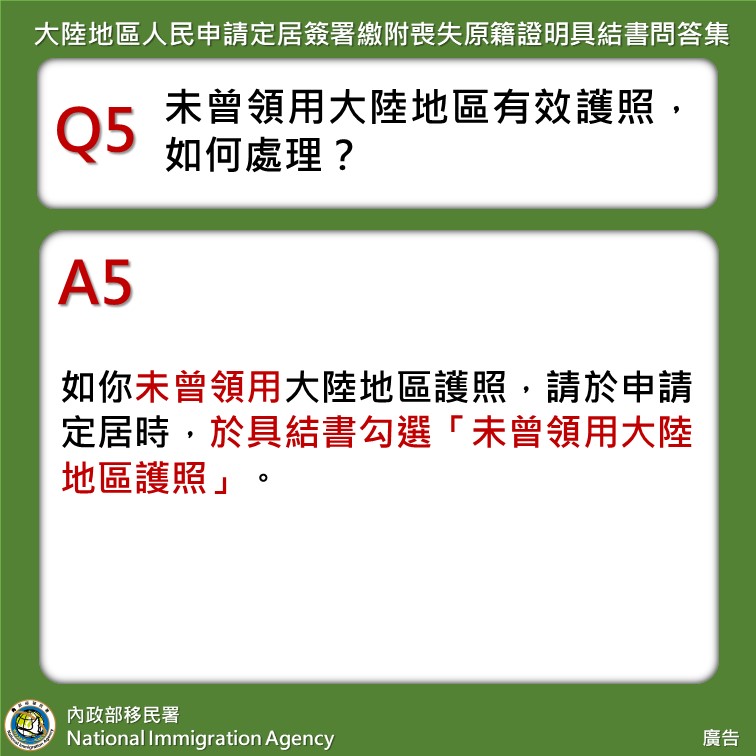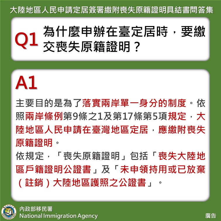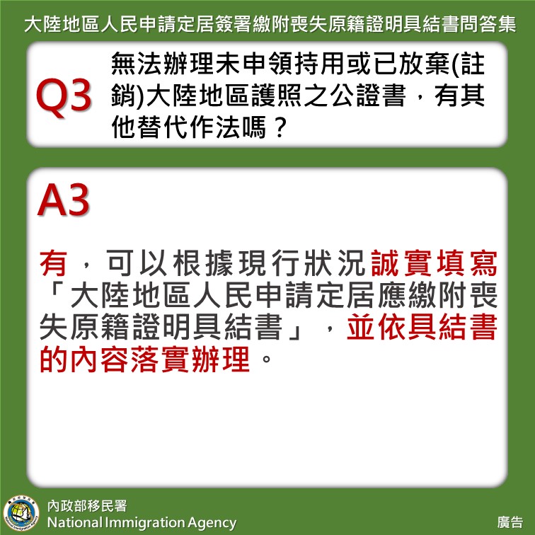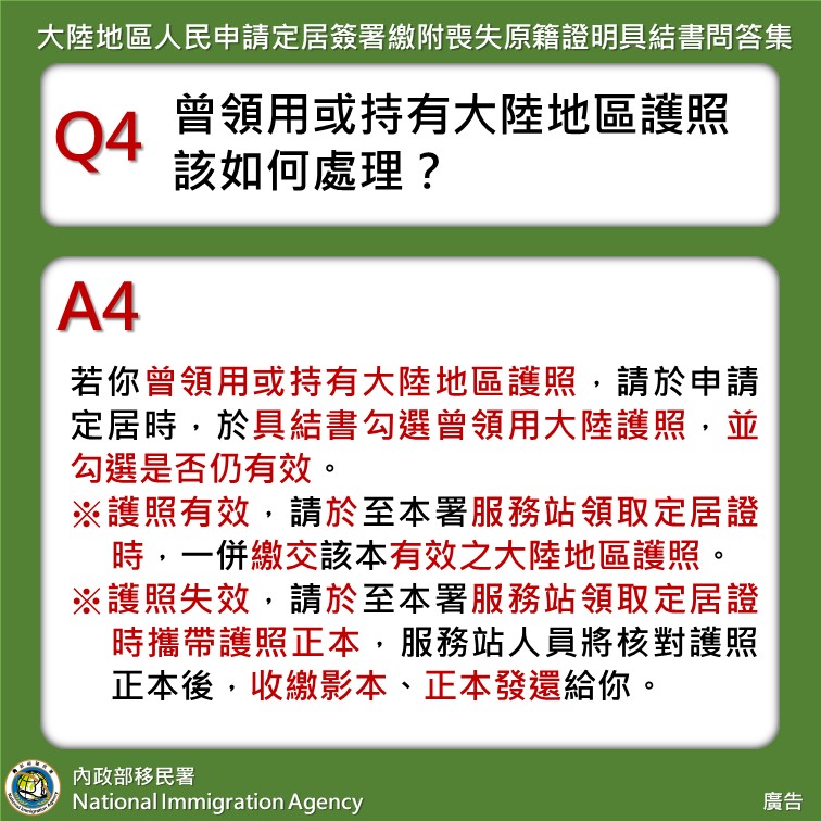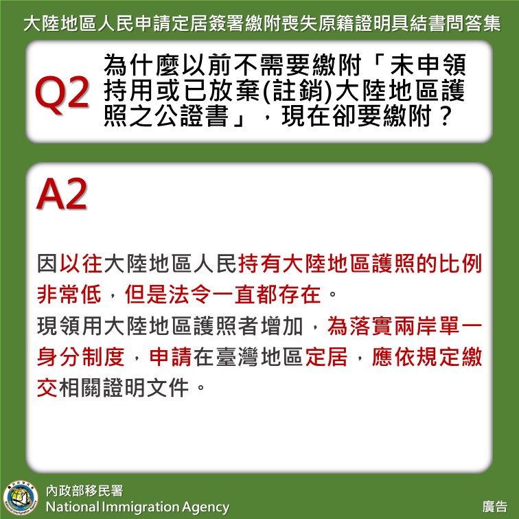 內政部令修正「大陸地區人民在臺灣地區依親居留長期居留或定居許可辦法」第三十條、第三十一條,明定大陸地區人民申請在臺灣地區定居,應備文件除喪失大陸地區戶籍證明之公證書外,並應繳附未申領持用或已放棄(註銷)大陸地區護照證明之公證書,該修正之許可辦法自114年10月31日起施行,相關細節請參考移民署網站。