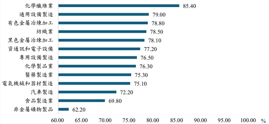 再由產業面來看,就過往文獻之定義,產能利用率一般可達80%,若超過85%代表需求旺盛而有供不應求現象,反之當產能利用率低於75%,供過於求和產能過剩現象就會出現。圖4整理中國大陸2024年主要製造業的產能利用率,可發現多數產業的產能利用率偏低,尤其在汽車製造、食品製造及非金屬礦物製品等類,出現明顯過剩現象。生產過剩的結果,亦反應在各產業庫存量的激增。如圖5所示,相對於2020年,2024年中國大陸幾乎各行業的存貨率均明顯增加,其中又以金屬礦物、石化、電子設備等存貨率達雙位數以上。