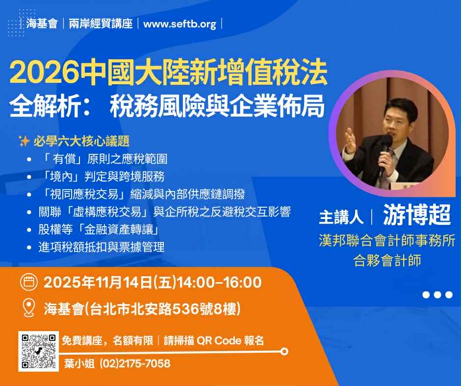 | 講座內容 | 2026年1月1日,中國《增值稅法》即將正式上路,全面取代實施逾30年的《暫行條例》 📌講座免費參加,席次有限,敬請預先報名。未經同意請勿採訪報導、錄音錄影。 |