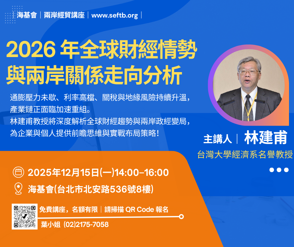 通膨壓力、升息高檔、關稅風險與地緣政治不確定性夾擊,產業鏈重組加劇。林建甫教授將深入解析 2026 全球經貿與兩岸政經情勢,為您剖析變局下的關鍵布局與策略建議,協助企業穩健前行、搶得先機!