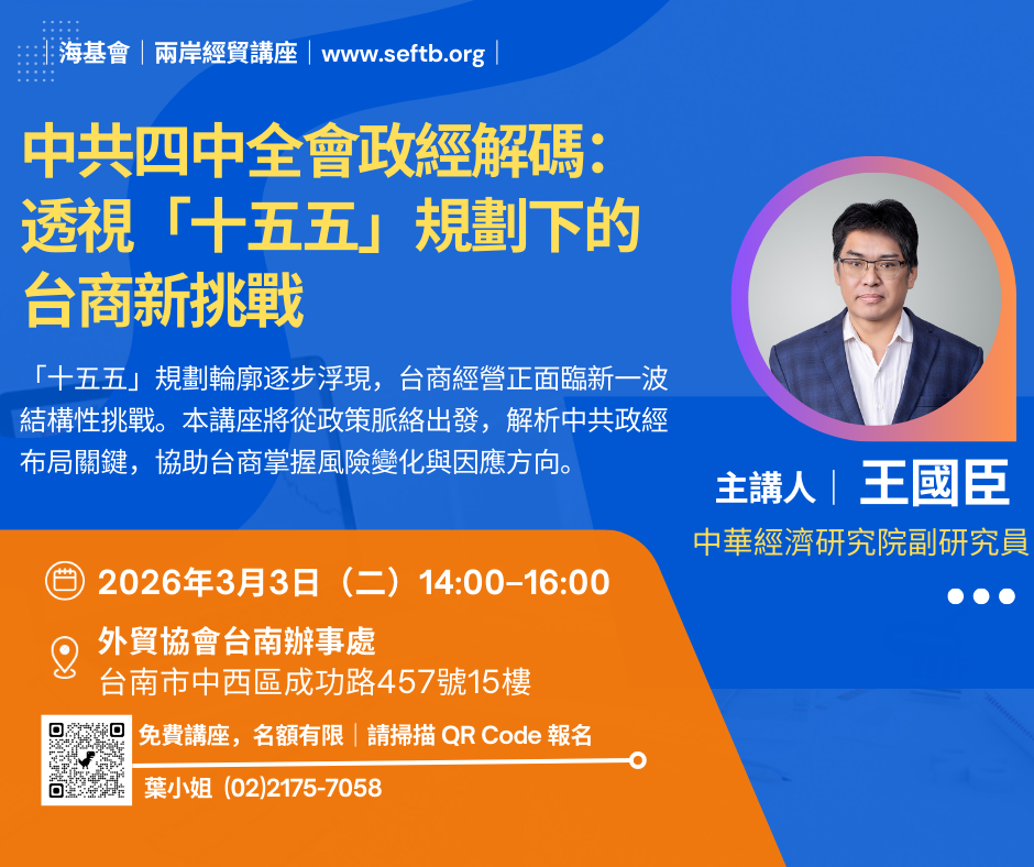 「十五五」規劃輪廓逐步浮現,台商經營正面臨新一波結構性挑戰。本講座將從中共政經政策脈絡切入,深入解析關鍵布局與可能影響,協助台商及早掌握風險變化,思考下一步因應方向。