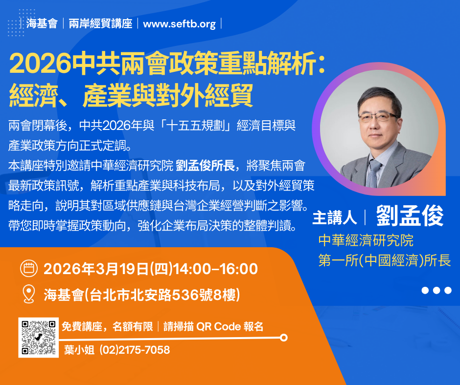 本講座特別邀請中華經濟研究院 劉孟俊所長,將聚焦兩會最新政策訊號,解析重點產業與科技布局,以及對外經貿策略走向,說明其對區域供應鏈與台灣企業經營判斷之影響。📌講座免費參加,席次有限,敬請預先報名。未經同意請勿採訪報導、錄音錄影。