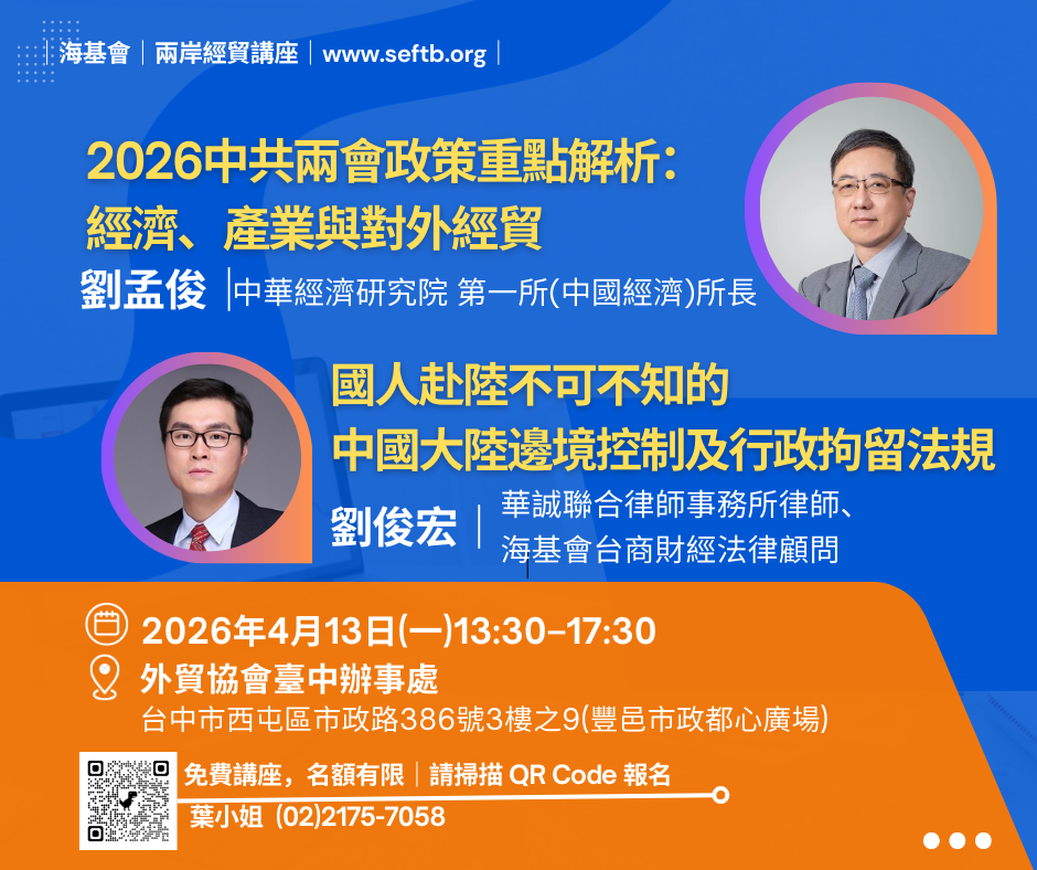 【台中】1.2026中共兩會政策重點解析:經濟、產業與對外經貿; 2. 國人赴陸不可不知的中國大陸邊境控制及行政拘留法規