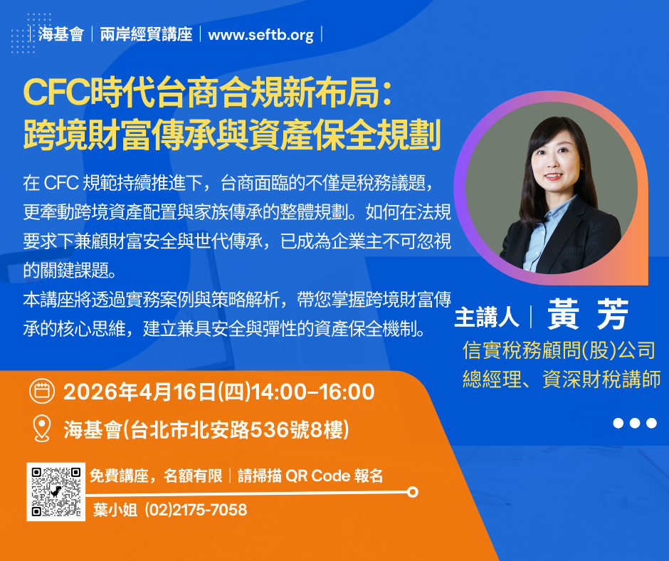 【台北】CFC時代台商合規新布局:跨境財富傳承與資產保全規劃